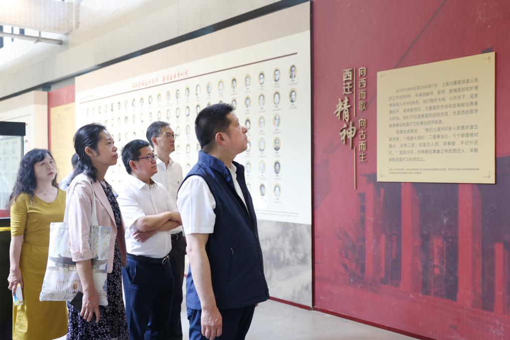 裘新一行参观了“弦歌西进——上医重医西迁精神主题展览”、西迁广场,瞻仰了西迁群雕和复建的抗战时期上医在歌乐山老校门。