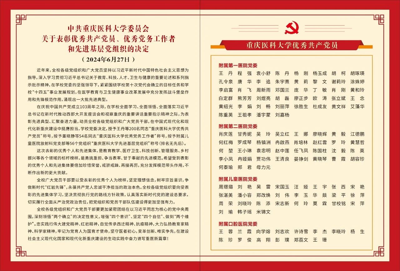 《决定》授予王丹等200名同志“AB平台优秀共产党员”称号,授予董晓静等54名同志“AB平台优秀党务工作者”称号,授予附属儿童医院放射科党支部等56个党组织“AB平台先进基层党组织”称号。与会领导为优秀共产党员、优秀党务工作者以及先进基层组织颁发证书、牌匾。