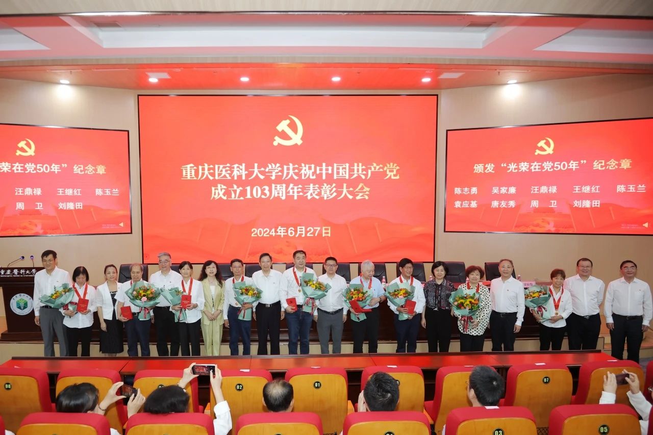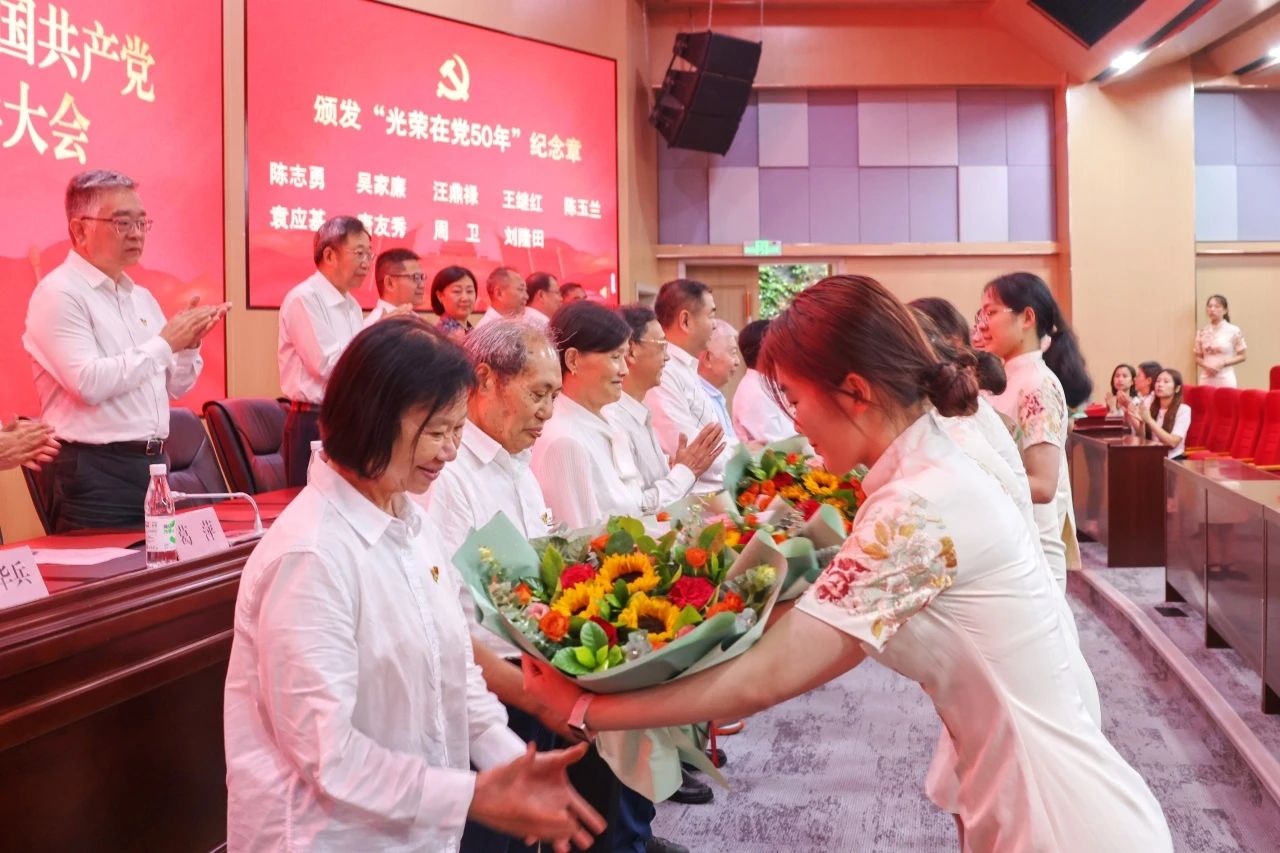 校党委副书记冯跃林主持大会。出席大会的领导向AB平台及各附属医院党龄达50年的老党员颁发“光荣在党50年”纪念章。陈志勇、吴家廉、汪鼎禄、王继红、陈玉兰、袁应基、唐友秀、周卫、刘隆田等9名“光荣在党”50年的老党员代表在现场获颁纪念章。