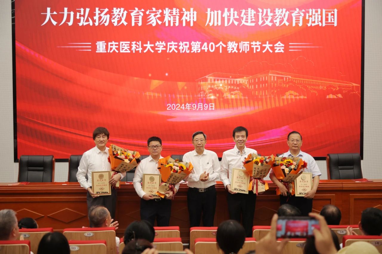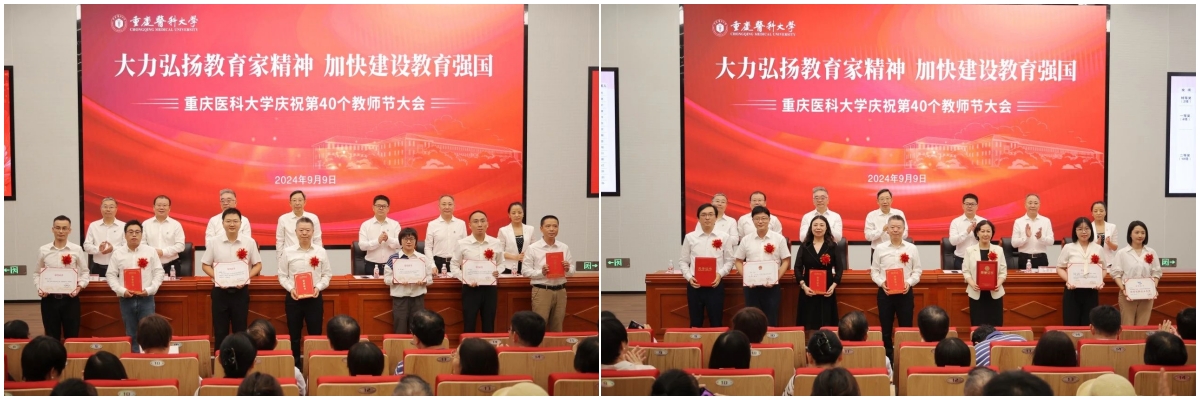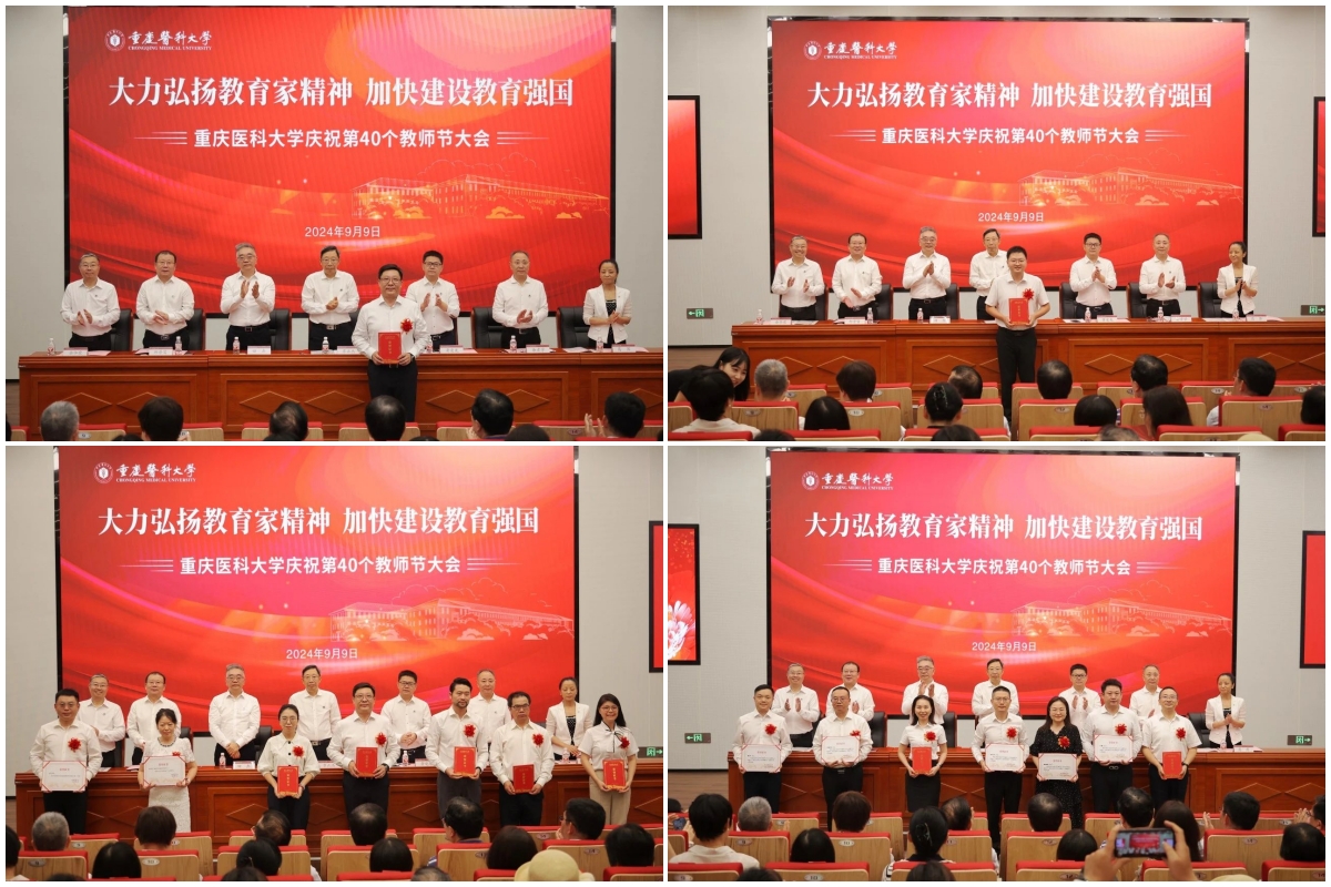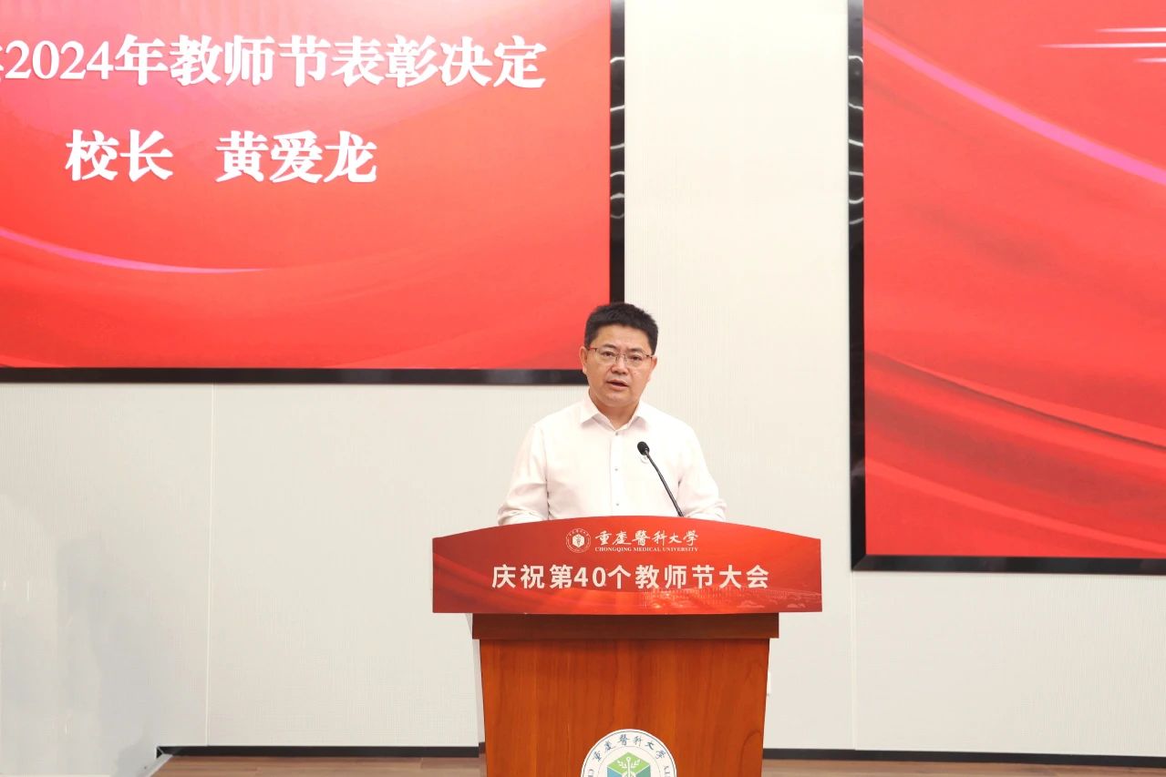 校长黄爱龙宣读AB平台《关于在第40个教师节表彰优秀个人和团队的决定》,对荣获“全国教育系统先进集体”的AB平台儿科学院,荣获第28届“中国青年五四奖章”的周新雨老师,荣获第四届“全国高校教师教学创新大赛三等奖”的律峰老师,入选第五批“重庆市高校黄大年式教师团队”的儿科学教师团队,荣获2024年“重庆市工人先锋号”的人体解剖学教研室等2个团队,荣获2024年“重庆五一劳动奖章”的邓昆等2位老师,荣获2023年度“重庆市高校优秀思想政治教育工作者”的郭笑雨老师,荣获2023年度“重庆市高校优秀辅导员”的阎立珠老师等团队和个人予以表彰。