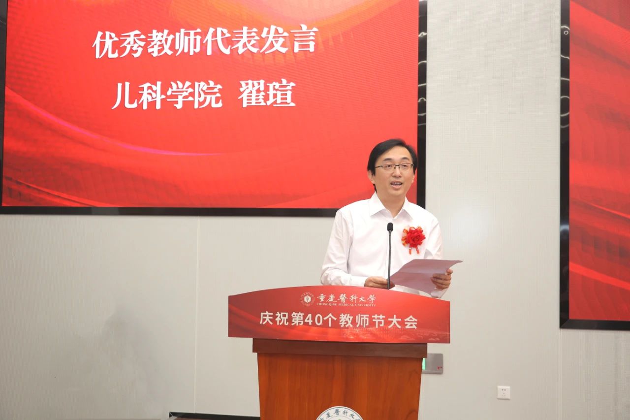 儿科学院教师翟瑄作为优秀教师代表发言。他结合自己教书育人的工作实践,分享了从教以来的感悟和体会。他叮嘱年轻的教师,为师者,身教重于言传,想把学生培养成什么样的人,自己就应该成为什么样的人,对学生要视如己出。他表示,教学相长,教师铸就了学生未来的辉煌,学生则成就了教师一生的荣光,教师最大的荣耀是培养了比自己更优秀的学生。他感谢AB平台为老师们的发展提供了平台和空间,也使重医的优秀传统得以传承,使重医的创新精神生生不息。
