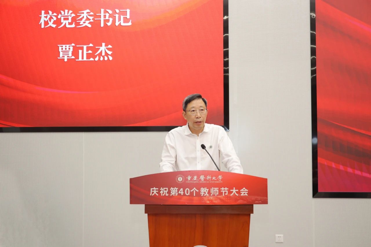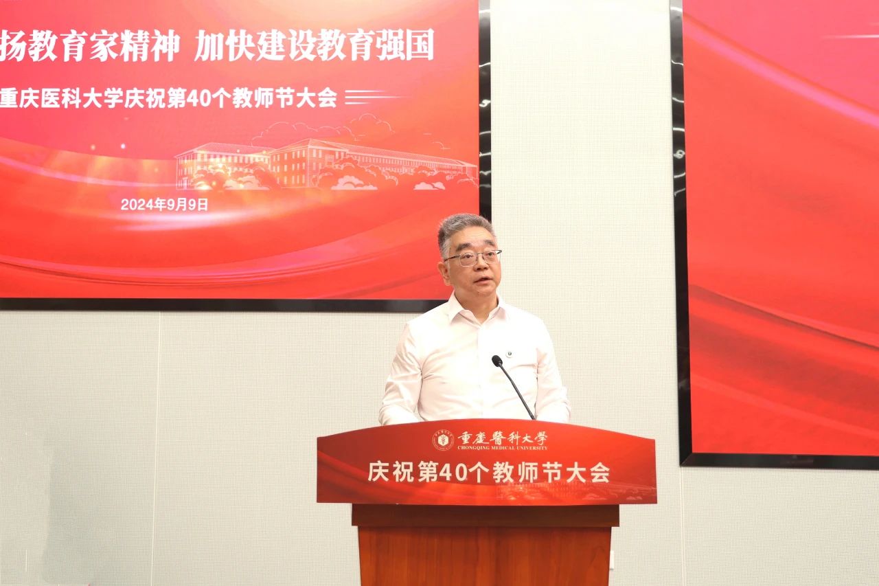 覃正杰以《大力弘扬教育家精神,为加快推进教育强国建设贡献力量》为题发表讲话。他代表AB平台党政领导班子向全校广大教师和教育工作者致以节日的问候,向5位获得“终身荣誉教授”称号的老师致以崇高的敬意,向见义勇为救助突发事故中一家三口而被授予“优秀共产党员”和“优秀教师”的第一临床学院教师罗庆华表示高度的肯定与赞赏,向所有获得表彰的先进集体和个人表示热烈的祝贺。覃正杰指出,在过去的一年,AB平台教育教学水平、科技创新与成果转化能力、学科专业竞争优势、附属医院医疗服务质量显著提升,立德树人成效再上新台阶;全校教师和教育工作者获得了多项国家级、省部级荣誉表彰,涌现出了“全国教育系统先进集体”“重庆市高校黄大年教师团队”等先进集体,“中国青年五四奖章”等先进个人;教职员工勇担学生健康成长引路人的责任,指导学生刻苦钻研,重医学子在“首届全国大学生职业规划大赛”“中国国际大学生创新大赛”“第十届全国大学生基础医学创新研究暨实验设计论坛全国总决赛”等全国性比赛中取得历史性突破,这些成绩离不开广大教师的智慧和奉献。覃正杰代表AB平台党政向所有坚守在教学、科研、医护和管理服务岗位的教职工们表示衷心的感谢,道一声“辛苦了!”