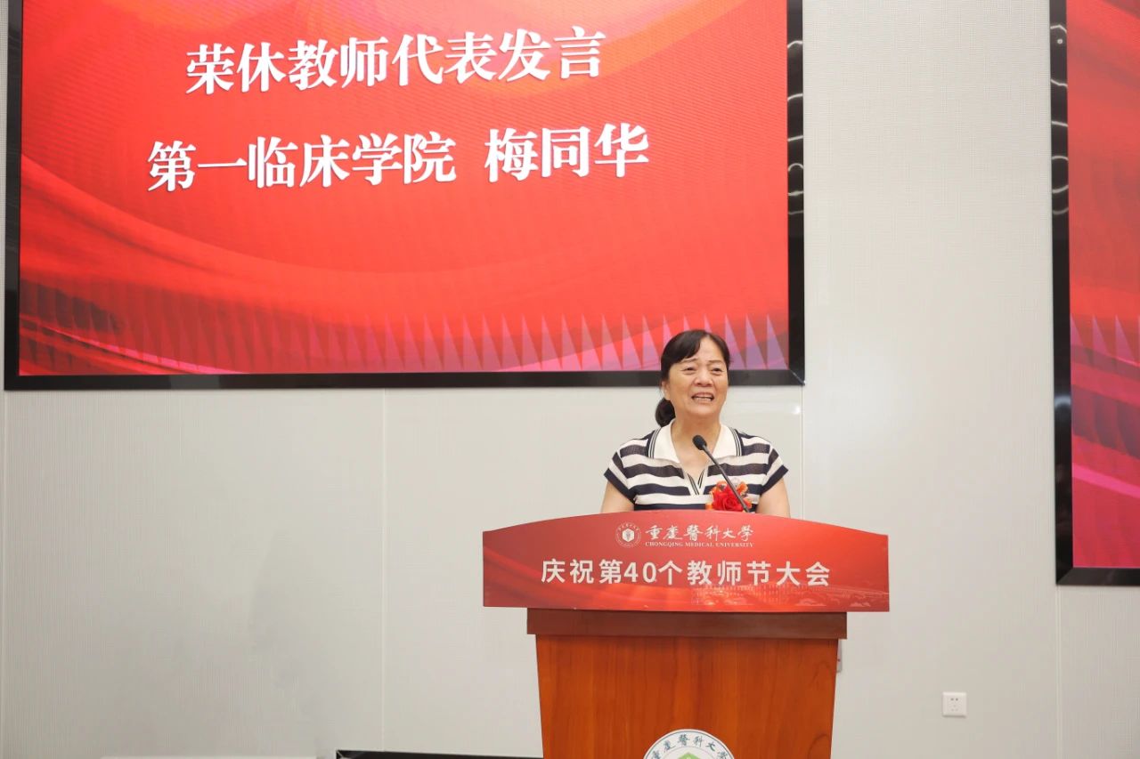 荣休教职工代表,第一临床学院梅同华老师发言。她回顾了自己在AB平台和医院工作的时光,从三尺讲台到无影灯下,从细致的病理解剖到严谨的教学查房,从宝贵的经验传承到关键的学术引领,几度春秋更迭,教师和医生的双重身份让她为国育才的信念更加笃定。她希望年轻一代的学子在更大范围内认知世界,在医学领域内实现突破,不负韶华,不负梦想,不负未来。