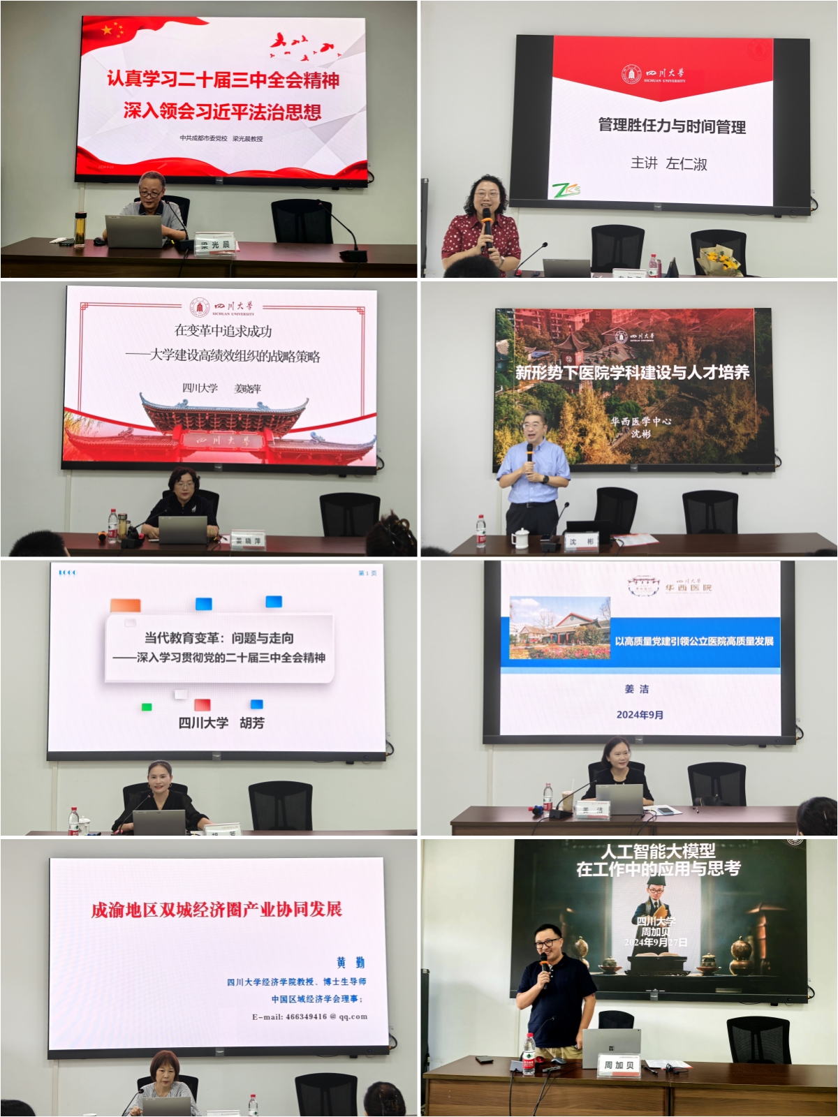 专题讲座包括“学习贯彻党的二十届三中全会精神,深入领会习近平法治思想”“成渝地区双城产业协同发展”等时政热点内容,“大学建设高绩效组织的战略策略”“新形势下医院学科建设与人才培育”等办学治校重点专题。来自成都市委党校、四川大学等单位的8位知名专家学者,结合自身多年理论研究与工作实践,为学员们传道、授业、解惑。