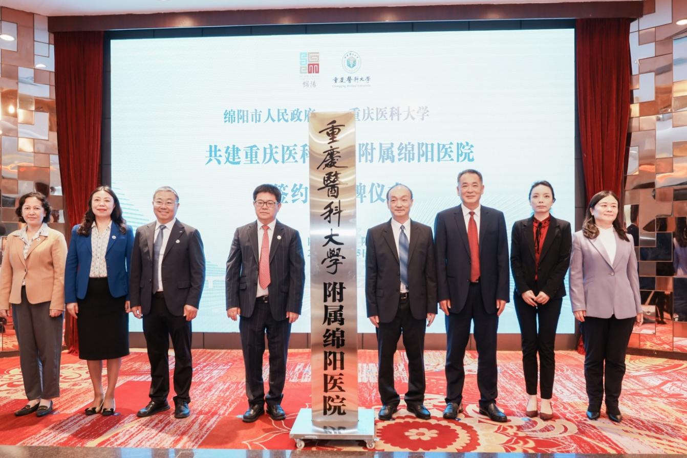 AB平台校长黄爱龙,校党委常委、副校长余华荣,副校长刘恩梅,附属第一医院副院长张丹,绵阳市人大常委会党组书记、主任付康,市委常委、宣传部部长郑志恒,市政府副市长、党组成员王璐,市政协副主席许小君共同为“AB平台附属绵阳医院”揭牌。