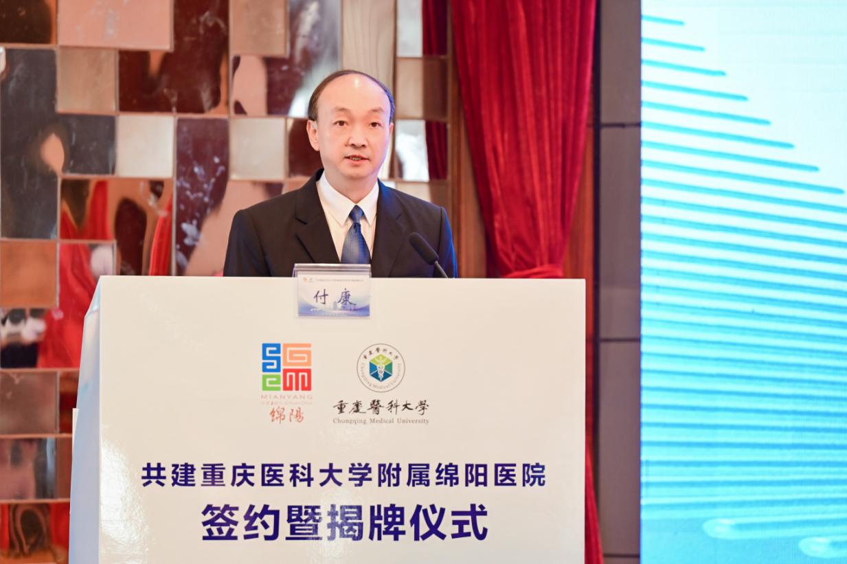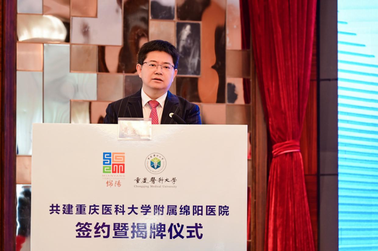黄爱龙代表AB平台诚挚欢迎附属绵阳医院加入重医大家庭。他表示,绵阳市作为党中央、国务院批准建设的中国唯一科技城,是四川第二大经济体,在积极探索卫生健康事业发展新路径方面取得了有目共睹的成绩。绵阳市第三人民医院发展势头强劲,与重医有着友好合作传统和坚实合作基础。此次AB平台与绵阳市大力推动附属绵阳医院建设,旨在携手打造成渝地区双城经济圈医学教育及医学创新协同发展的“高标识度样板”,为成渝地区双城经济圈建设乃至西部地区医疗卫生事业高质量发展作出新的更大贡献。