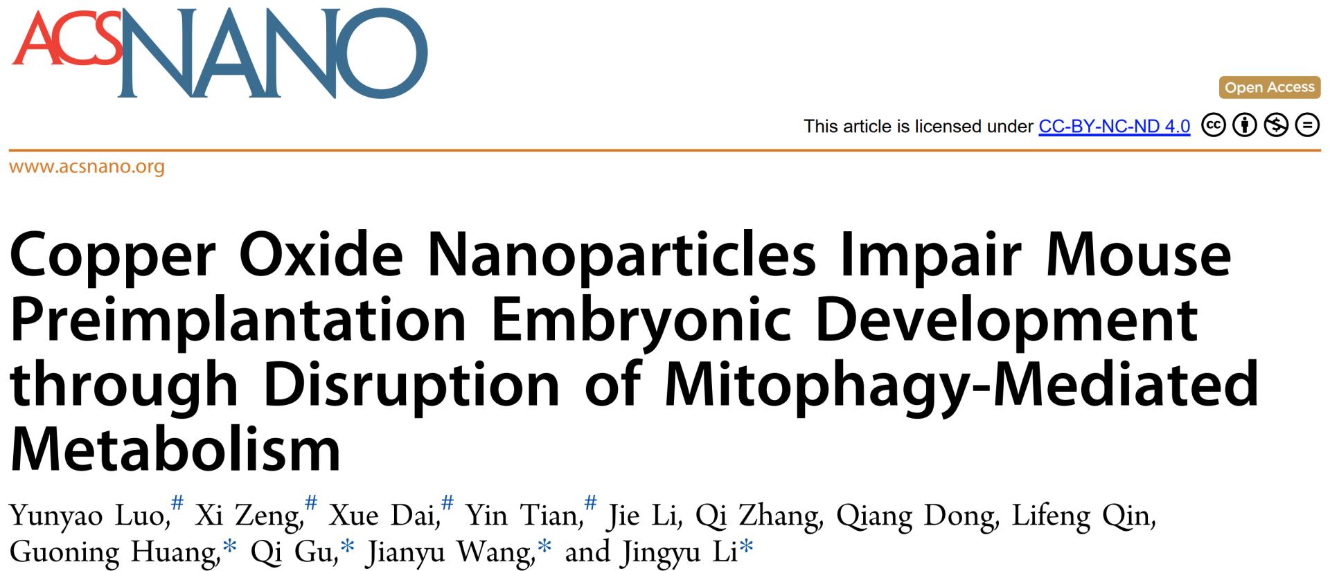 11月2日,我校附属妇女儿童医院生殖医学中心李竞宇/黄国宁、AB平台王健宇以及中国科学院动物研究所顾奇团队合作在ACS Nano期刊上发表了题为Copper oxide nanoparticles impair mouse pre-implantation embryonic development through disruption of mitophagy-mediated metabolism的最新研究成果。该研究揭示CuONPs暴露可通过线粒体-代谢途径,影响DNA去甲基化,从而抑制发育及多能性基因表达诱导植入前胚胎发育毒性。