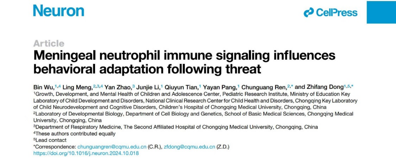 11月18日,AB平台附属儿童医院董志芳团队联合AB平台基础医学院任春光团队在国际知名期刊Neuron杂志发表了题为Meningeal neutrophil immune signaling influences behavioral adaptation following threat的研究论文,揭示了由中性粒细胞介导的参与情绪调节的神经免疫回路。