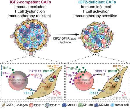 CD8+T细胞杀伤肿瘤细胞,对于抗肿瘤免疫至关重要,但其常无法有效浸润到癌组织中,这是导致肿瘤免疫逃逸及免疫治疗耐药的重要原因,而详细机制不明。此外,CAFs是肿瘤微环境(Tumor microenvironment, TME)的重要组成成分,在肿瘤免疫逃逸和免疫治疗耐药中常扮演关键角色,但具体机制仍不清晰。该研究发现肿瘤相关成纤维细胞(Cancer-associated fibroblasts, CAFs)来源的胰岛素样生长因子2(Insulin-like growth factor 2,IGF2)作为关键上游分子可通过调控CAFs促癌功能构建物理和化学屏障,抑制CD8+T细胞浸润及抗肿瘤活性,促进肿瘤免疫逃逸与免疫治疗耐药,为肿瘤诊疗提供了潜在的分子标志物和治疗靶点。