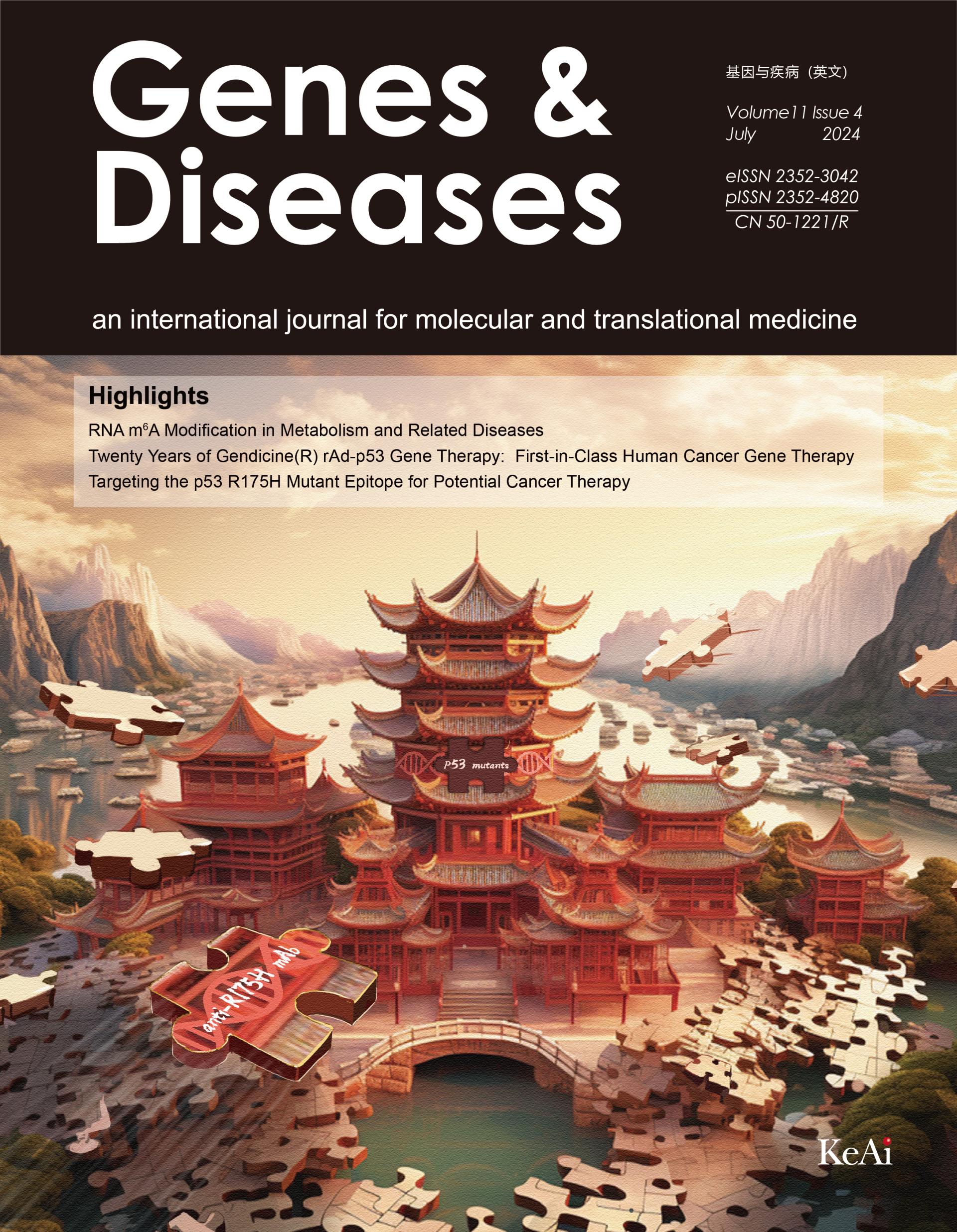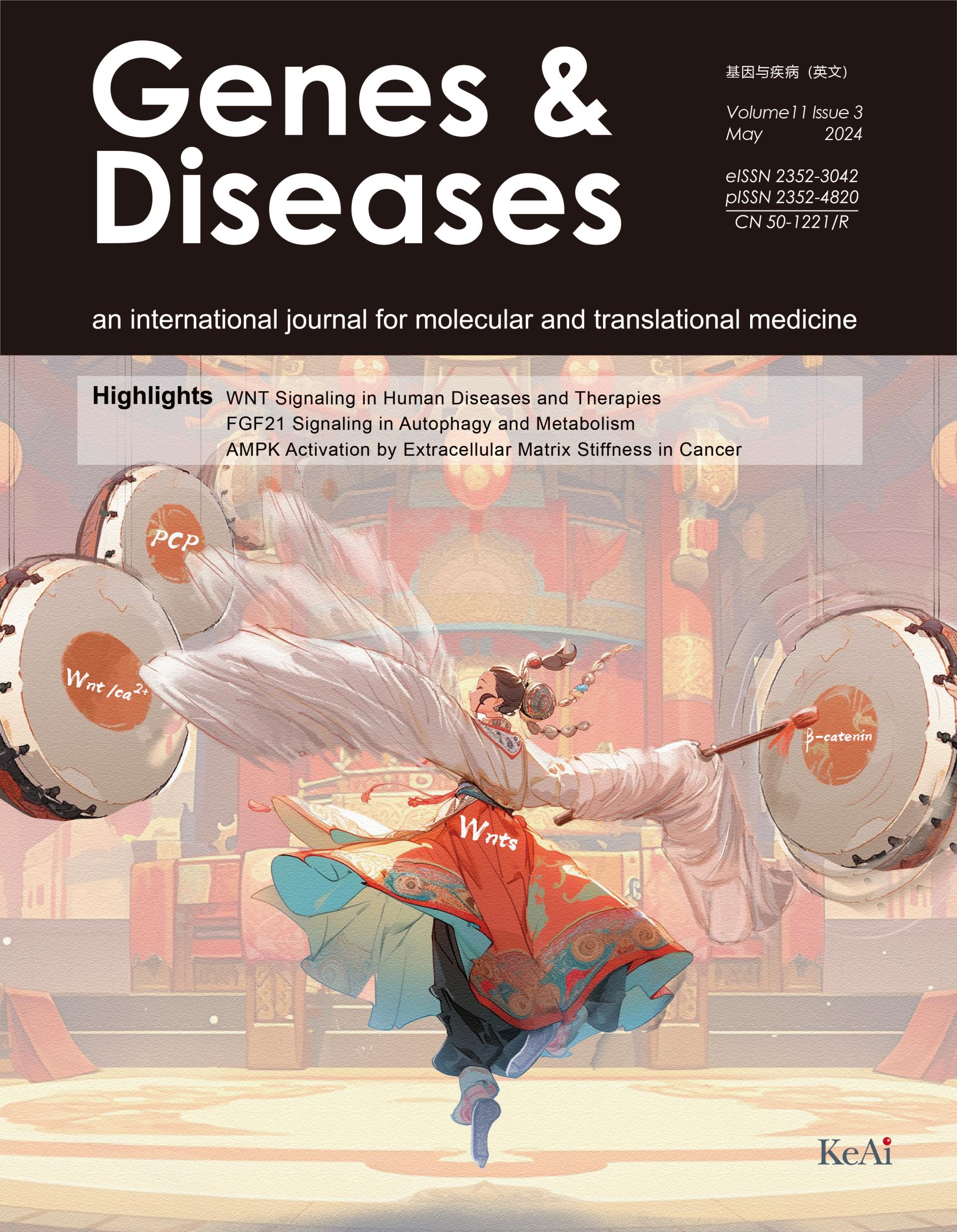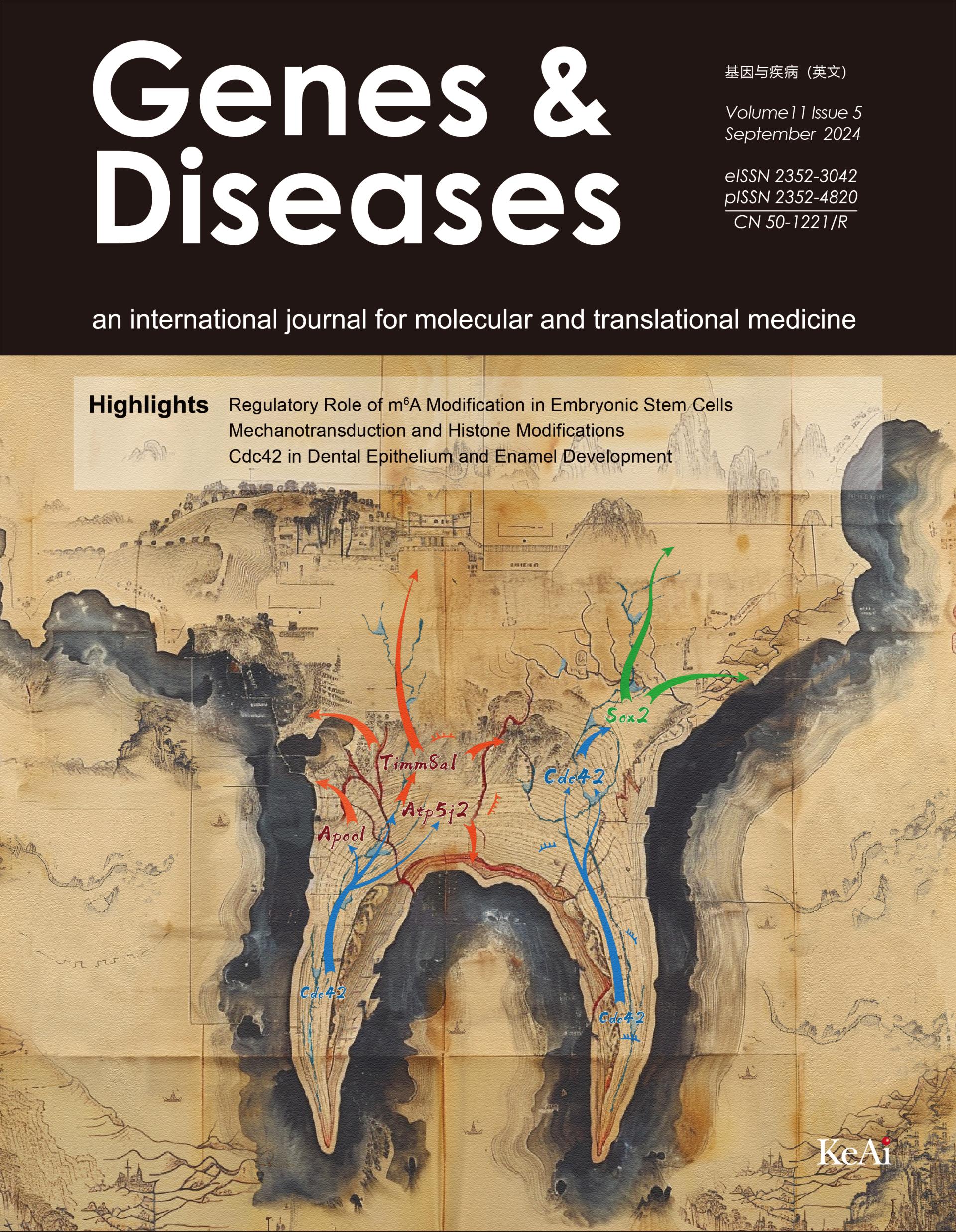 Genes & Diseases创刊于2014年9月,由我校校长黄爱龙教授与芝加哥大学医学中心何通川教授共同担任主编,定位为国际化、高影响力的生物医学综合性科技期刊,目前已被SCIE、PMC、Scopus、DOAJ、CSCD(核心库)、CAS、中国科技核心数据库等国内外知名数据库收录,2021年由季刊变更为双月刊。2019年至2023年影响因子分别为4.803、7.103、7.376、6.8及6.9,在JCR分区中一直稳居生物化学与分子生物学、遗传学两个学科Q1区。获得“中国最具国际影响力学术期刊”Top 5%、中国高校科技期刊建设示范案例库·杰出科技期刊、川渝一流科技期刊、重庆市精品英文科技期刊、重庆市名刊等多项荣誉。Genes & Diseases在AB平台领导,各院系、附属医院的支持下不断发展壮大,得到了国内外同行的关注、推动了学术的国际交流合作、促进了AB平台学科的发展。