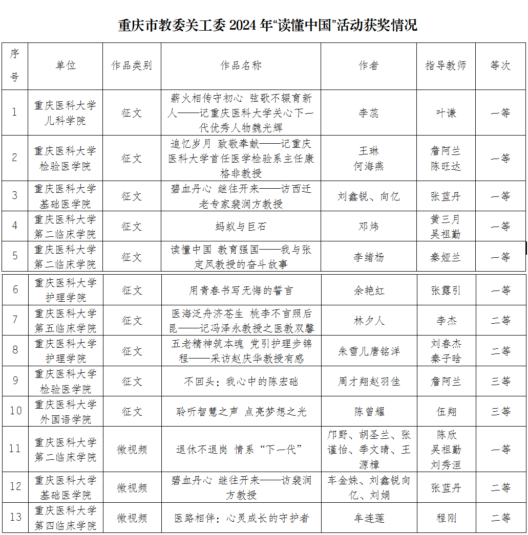 近日,在教育部关工委举办的2024年“读懂中国”活动中,我校儿科学院选送的《薪火相传守初心,弦歌不辍育新人》荣获最佳征文,第二临床学院选送的《退休不退岗,情系下一代》荣获优秀微视频。