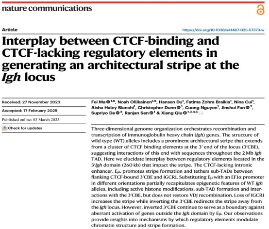 2025年3月3日,我校附属儿童医院邱翔教授作为唯一通讯作者,在国际知名学术期刊《Nature Communications》上发表了题为《Interplay between CTCF-binding and CTCF-lacking regulatory elements in generating an architectural stripe at the Igh locus》的研究论文。该研究深入揭示了染色质三维空间结构形成的新机制,为基因组调控领域提供了新的科学见解。