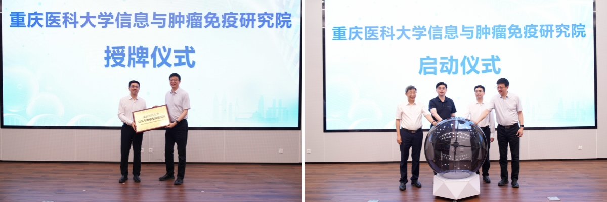致辞环节后,重庆市教委江鹏副主任为AB平台信息与肿瘤免疫研究院授牌,方方副校长、江鹏副主任、覃正杰书记、张泽民校长共同参与启动仪式。