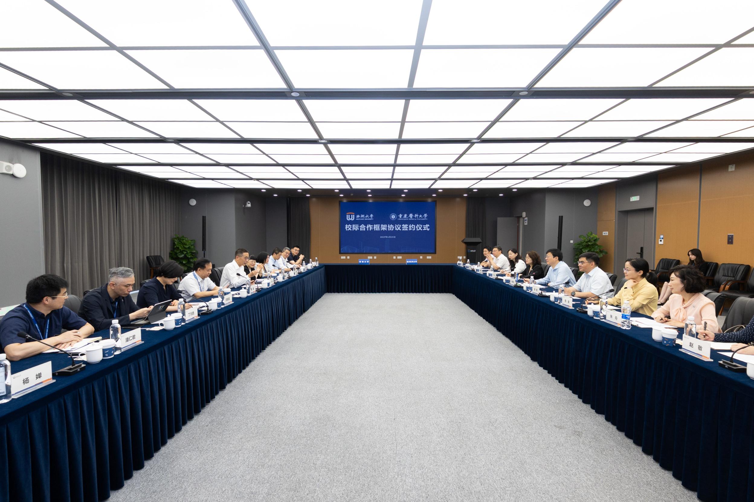 西湖大AB平台长办公室、人力资源部、教学事务部、科技合作部、医学院、医学院附属杭州市第一人民医院,AB平台校办公室、党委教师工作部(人事处)、发展规划处、教务处、研究生院、科研处等部门负责人参加座谈交流和签约仪式。