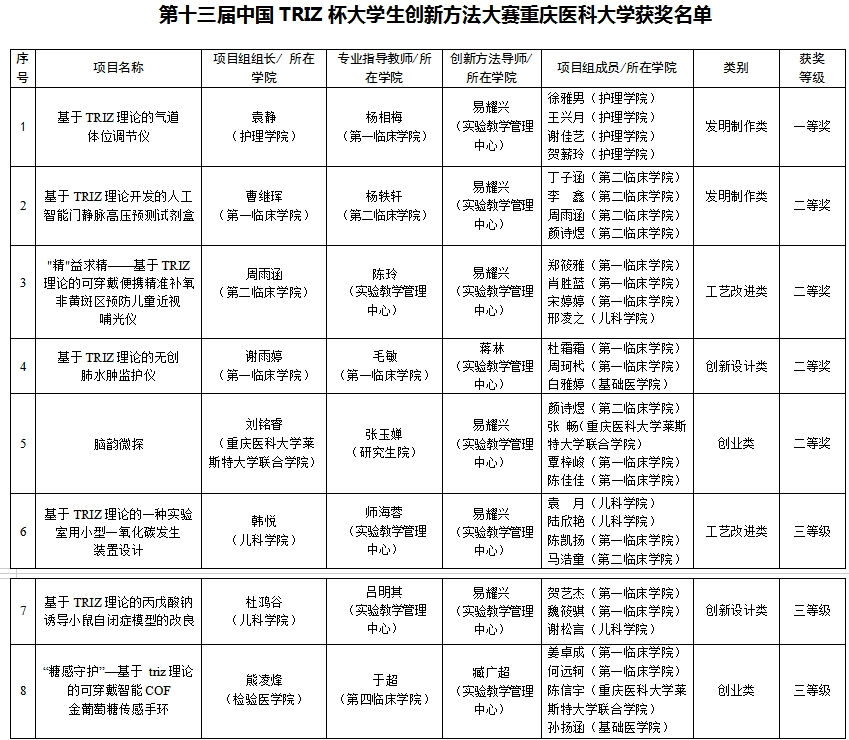 我校基于“AB平台-市级-国家级”三级大学生创新创业训练计划,深度融入TRIZ理论,鼓励学生运用TRIZ解决临床实际问题。依托生物医学创新创业实践基地,配备“TRIZ导师+专业导师”的双导师团队,搭建师生对接平台,通过TRIZ理论培训和项目打磨筛选出优质医学创新项目。在前期校赛阶段共有30个团队成功报名,经决赛答辩25个团队脱颖而出,推荐进入市赛;在重庆市比赛中,我校共获得特等奖2项、一等奖5项、1项二等奖,三等奖7项,位居市内高校前列。其中获得二等奖以上的8个项目获推进入国赛,经国赛决赛网评,3项获评为三等奖,5项进入现场总决赛争夺一、二等奖。在现场总决赛的赛场上,我校5支团队的代表讲解自信流畅,答辩沉着冷静,充分展示了我校学子的双创风采和“TRIZ+医学”的融合优势,圆满完成总决赛比赛任务,取得优异成绩。