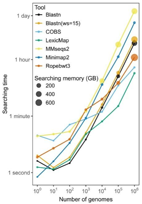 本研究中,作者开发了一个全新的序列比对软件LexicMap,支持在百万规模原核(细菌与古菌)基因组中,对基因、质粒、长读长测序数据进行准确、快速、低内存的碱基水平序列比对。与现有方法(包括Blastn、Minimap2、MMseqs2、Ropebwt3)相比,LexicMap在保持相当准确性的同时,速度更快、内存占用更低、具有更高的可扩展性。