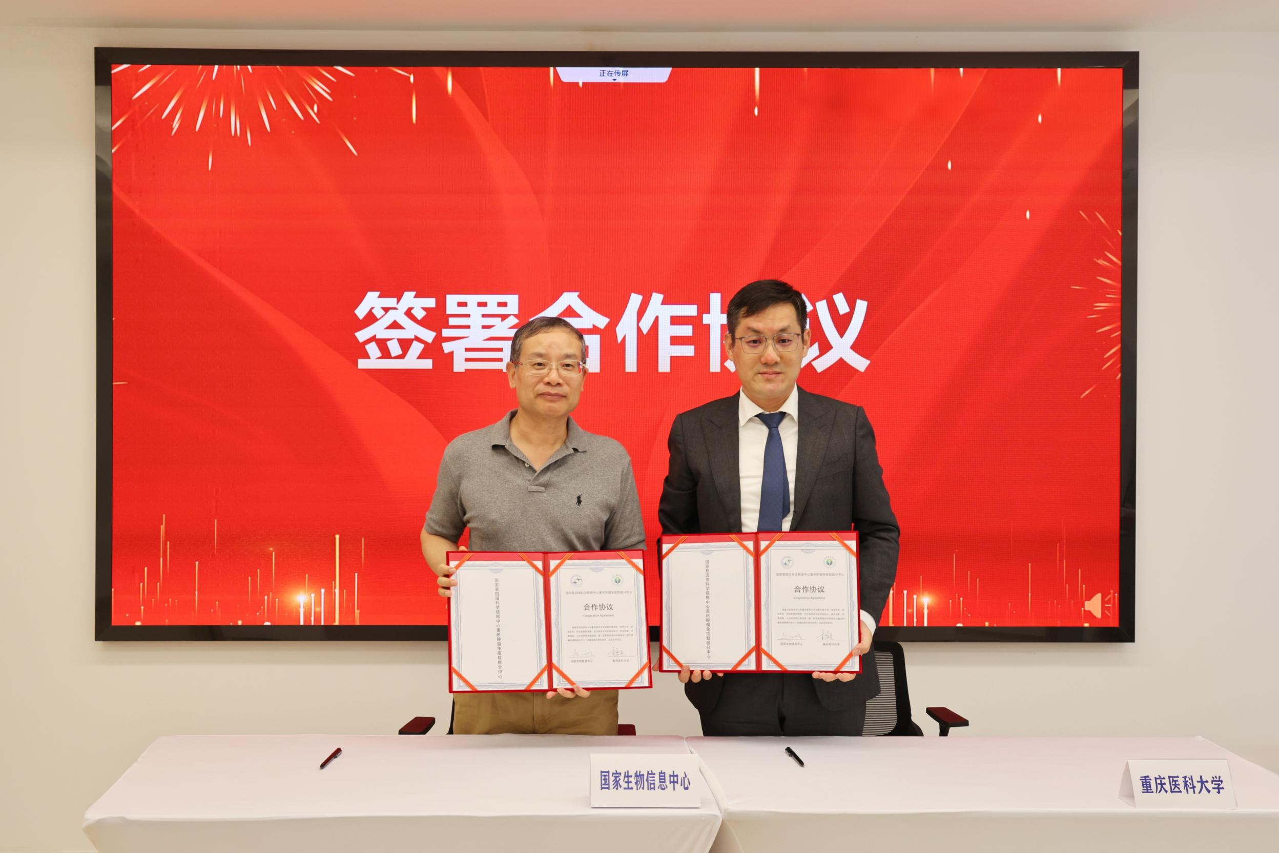 鲍一明与李华兵代表双方签署了《建设国家基因组科学数据中心重庆肿瘤免疫数据分中心合作协议》。