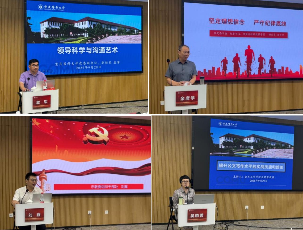 本次培训坚持组织需求、岗位需求和干部需求相统一,课程设置丰富多样,涵盖党的创新理论、党性教育和履职能力培训等多个方面。袁军,党委常委、纪委书记,市监委驻AB平台监察专员余彦学等校领导,围绕领导科学与沟通艺术、强信念守底线等内容作专题辅导,市教委组干处处长刘鑫作干部管理监督政策辅导,公共卫生学院教授吴晓蓉讲授提升公文写作水平的实战技能和策略。本次培训还安排了“西迁精神”现场教学、分组学习研讨,旨在推动理论与实践深度融合,切实提升干部政德素质和履职能力。