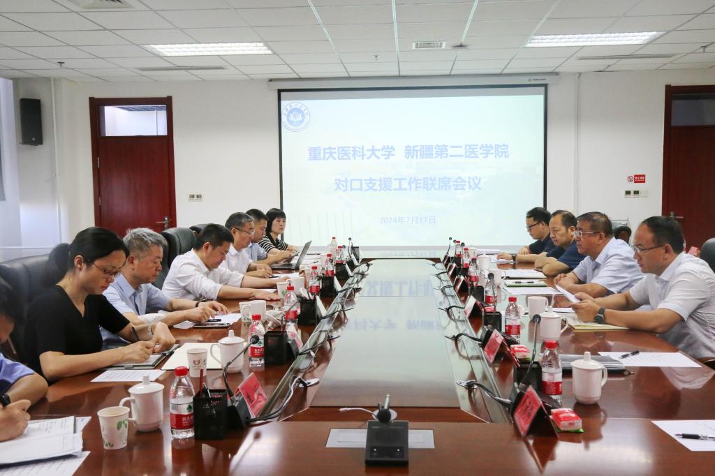 调研期间,两校共同召开对口支援工作联席会。冯述光、李建光详细介绍了新疆第二医学院的发展历程、存在问题、发展规划,说明了自去年两校开展对口支援以来有关工作进展情况、AB平台专家组反馈的办学工作考察意见整改落实情况,同时就对口支援下一步工作提出了需求事项,希望深化AB平台校际合作,加快建成“特色鲜明、疆内一流、区域知名”的高水平应用型医学院校。