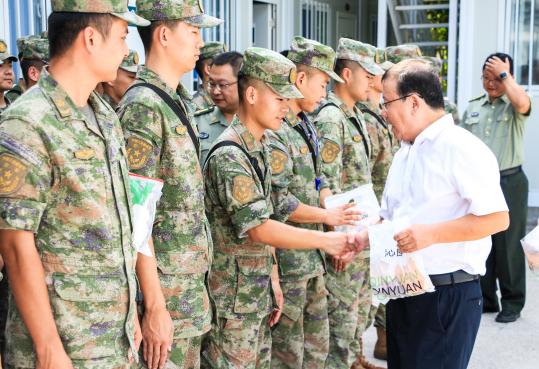 校领导一行来到校内教官驻地,代表AB平台党政为教官们带来节日的祝福。同时,校领导对教官们在本次军训中的辛勤付出表示衷心感谢,希望教官们发扬军队优良传统,在军训中着力培养我校2024级新生遵规守纪的意识、不畏艰难险阻的意志品质以及良好的国防军事技能。