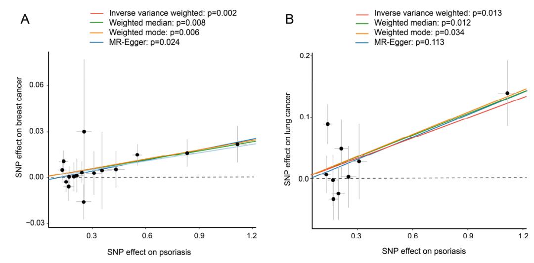 研究团队进一步纳入74个银屑病特异性基因遗传位点(P < 5×10⁻⁸)以构建银屑病的多基因风险评分(PRS),PRS 分析研究结果显示,遗传预测的银屑病仍与乳腺癌、肺癌的高风险相关。该研究结果表明,银屑病患者部位特异性癌症风险显著增加,并且这种风险在性别上存在差异。此外,银屑病与乳腺癌、肺癌的风险增加之间具有因果关系,建议临床上应关注银屑病患者乳腺癌和肺癌的风险,这一研究为银屑病患者管理提供了全新见解。