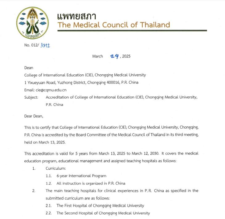 2025年3月,我校来华留学临床医学专业(英语授课)本科教育项目在泰国医学会2025年第3次执委会上首次通过认证,有效期为5年(2025年3月13日至2030年3月12日)。