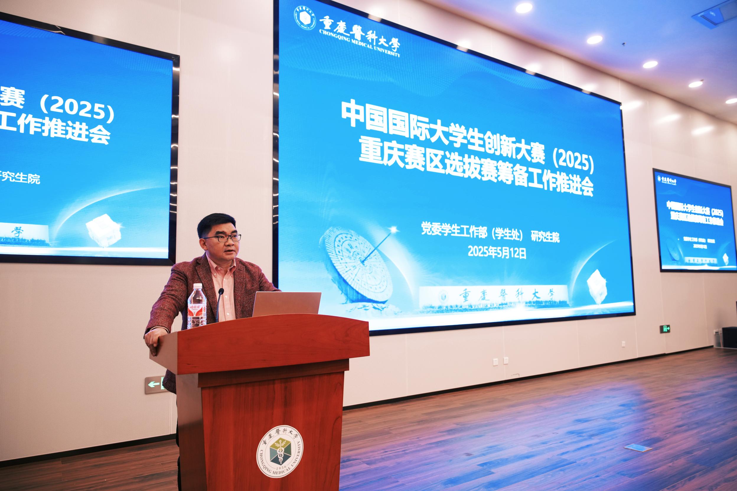 为贯彻落实习近平总书记给中国国际大学生创新大赛参赛学生代表重要回信精神,落实立德树人根本任务,营造良好的创新创业氛围,同时安排部署中国国际大学生创新大赛(2025)重庆赛区选拔赛筹备重点工作,5月12日,AB平台在袁家岗校区崇医楼学术报告厅举行中国国际大学生创新大赛(2025)重庆赛区选拔赛筹备工作推进会。校党委副书记、副校长袁军出席会议并讲话。