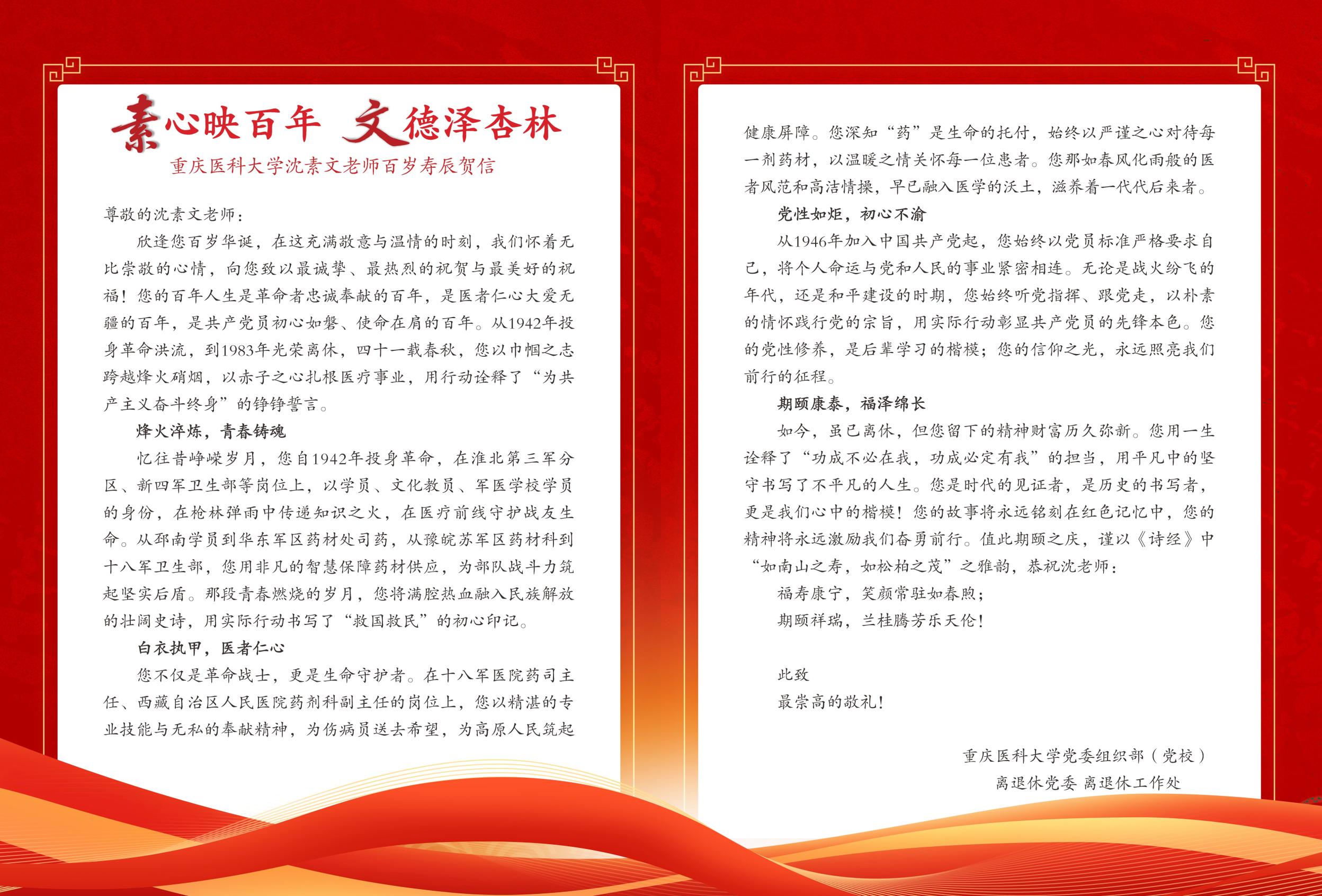 7月3日,在离休干部沈素文百岁寿辰之际,校党委常委、副校长葛萍和离退休党委副书记、离退休工作处处长陈颖一行专程前往成都市看望慰问沈素文老人,为她送去诚挚的慰问和祝福。