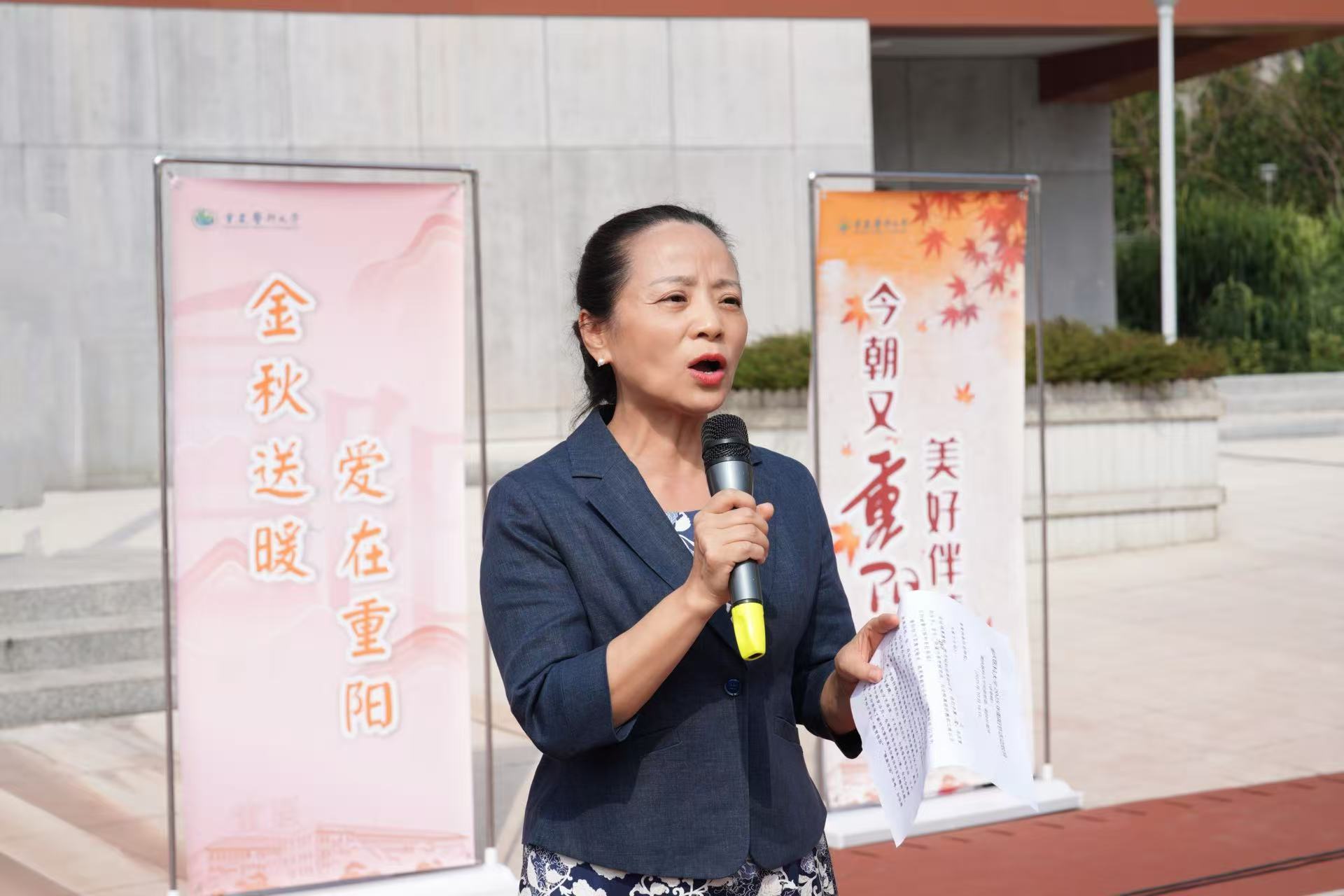 10月16日下午,离退休工作处主办的“金秋送暖,爱在重阳”重阳节庆祝活动在袁家岗校区足球场上举行,近五百名离退休教职工齐聚一堂,共庆佳节。校党委常委、副校长葛萍出席活动,离退休工作处处长陈颖主持。