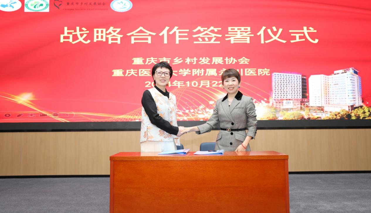 为推动健康乡村建设,进一步提升乡村地区医疗服务水平,改善人民群众的健康福祉。10月22日,附属永川医院在医院的学术厅与重庆市乡村发展协会签订了“健康乡村千里行”战略合作协议。