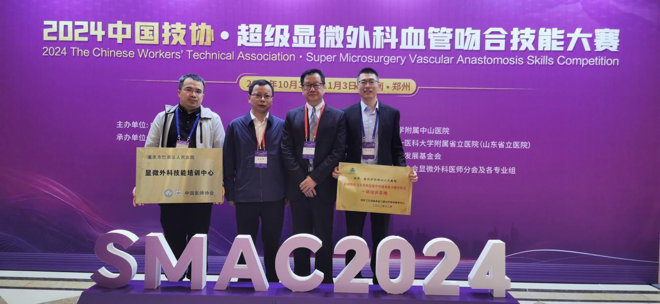 近日,由中国职工技术协会、中国医师协会显微外科分会主办的“2024中国技协·超级显微外科血管吻合技能大赛”在郑州圆满落幕。附属巴南医院创伤外科(创伤/手足显微外科)傅景曙副主任带领张仁权主治医师和刘桂勇主治医师,参加了此次大赛,在全国73支参赛队伍和219组438名参赛选手中脱颖而出,于“0.2mm精英组”个人赛和团体赛中取得了优异的成绩,迈出了附属巴南医院显微外科从重庆走向全国的重要一步。