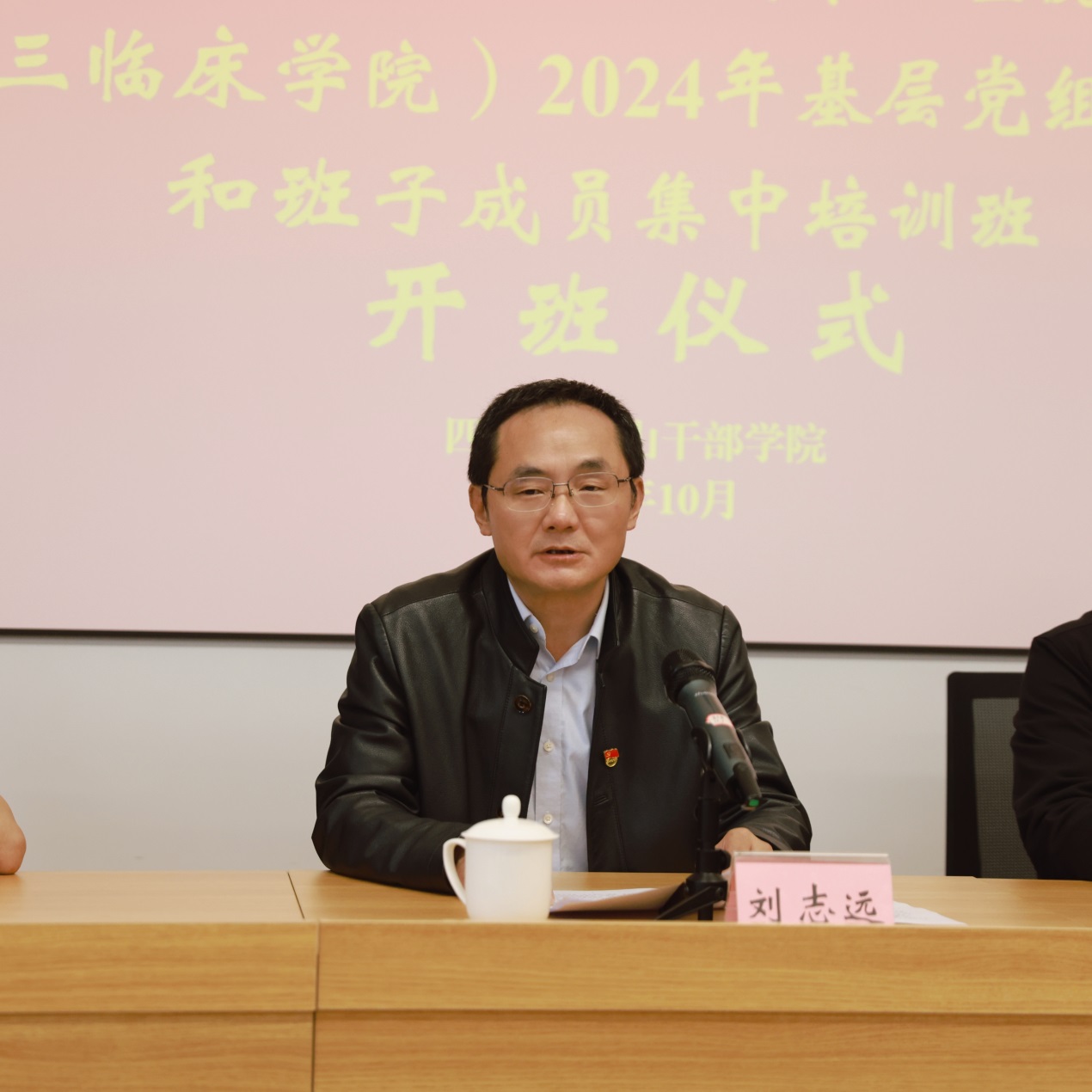 开班仪式上,巴中市委党校(四川大巴山干部学院)副校(院)长王全明致欢迎辞并授班旗;医院党委书记刘志远作开班动员讲话;院党委委员、党办主任裴仲琦接班旗。
