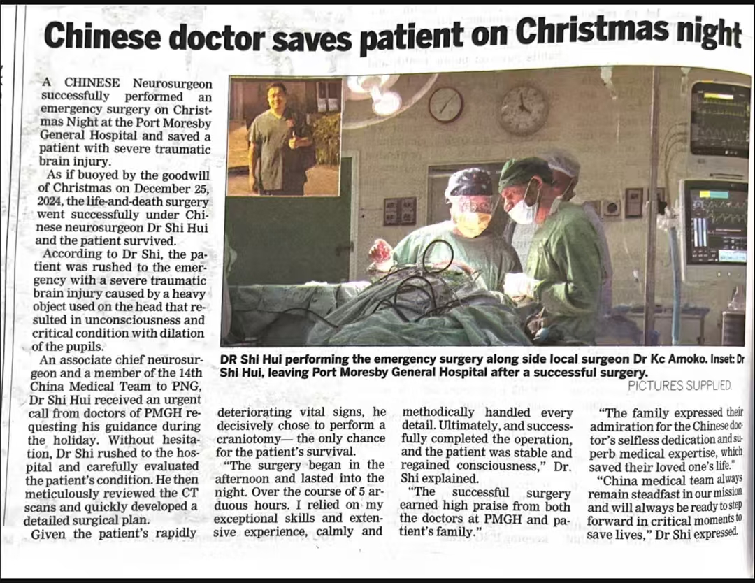 2024年12月25日,是巴布亚新几内亚人民阖家欢乐共迎新年的日子。当日,来自附属永川医院神经外科的石会医生在巴新的莫尔兹比港总医院面临了一场“生死时速”紧急救治的考验,用实际行动生动诠释了中国医生大爱无疆的精神。该救治事迹被当地国家级报纸《巴新邮报》(1月8日版)报道。