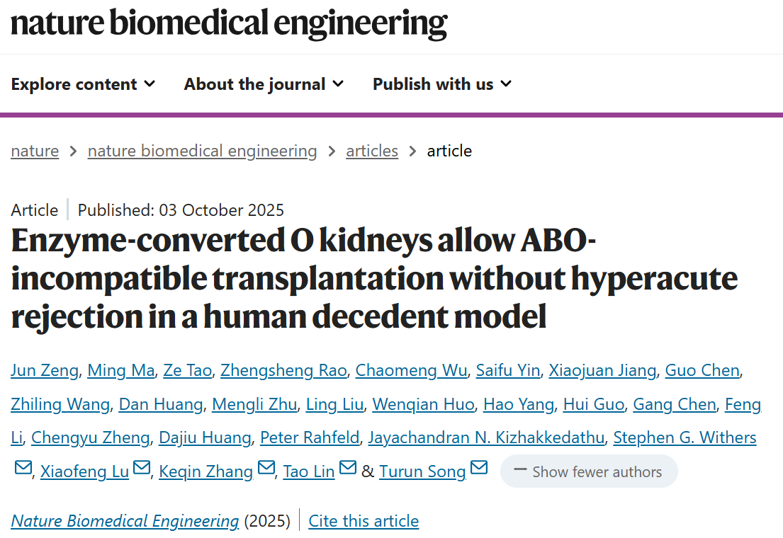 10月3日,AB平台附属第二医院与四川大学华西医院联合研究团队在顶刊Nature Biomedical Engineering发表了将A型肾脏经酶转化变为“通用O型”肾脏,并成功移植给跨血型受者的研究成果。这是继今年初完成B型肾脏转化移植后,该团队在一年内取得的第二项世界级突破,标志着我国在跨血型器官移植领域全球领先。