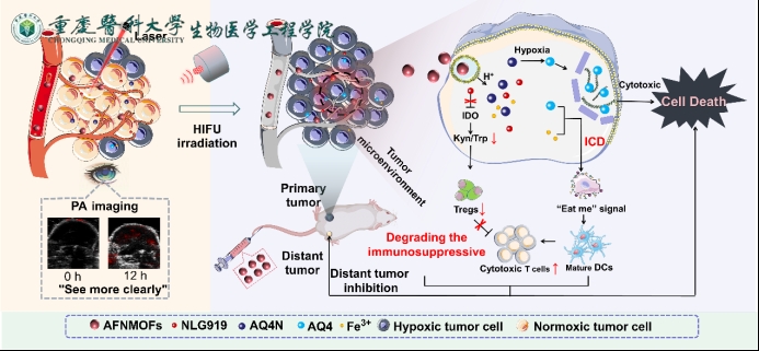 HIFU无创治疗恶性肿瘤已展示出良好前景,其诱导的抗肿瘤免疫应答在预后扮演着重要角色,但强度和持续时间有限是术后免疫治疗的最大障碍。本研究结合HIFU术后肿瘤重度乏氧的特征,开发了一种由Fe3+、乏氧激活前药AQ4N和IDO-1信号通路抑制剂NLG919配位构建的金属有机框架纳米系统(Fe3+/AQ4N/NLG919),增强机体抗肿瘤免疫应答。该纳米系统在肿瘤部位靶向聚集后,负载的AQ4N可显著增强光声成像效果,实现更精准的术中导航。随后,在HIFU术后重度乏氧环境中,AQ4N被顺次激活,与Fe3+协同诱发残留细胞高免疫原性死亡,并联合NLG919阻断IDO-1信号通路克服因乏氧加重的微环境免疫抑制。体内研究结果表明,该纳米系统在术后可激发机体高强度、持久性免疫应答,有效抑制了原发/远端肿瘤的生长和肺转移。这项研究为改善包括HIFU在内的所有外科手术的整体预后提供了新见解。