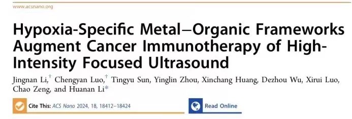 近日,我校李桦楠副研究员团队在国际知名学术期刊ACS Nano(最新影响因子15.8)发表了题为“Hypoxia-specific metal-organic frameworks augment cancer immunotherapy of high-intensity focused ultrasound”的研究论文,报告了一种新型纳米诊疗剂用于增强HIFU术后抗肿瘤免疫治疗的研究。