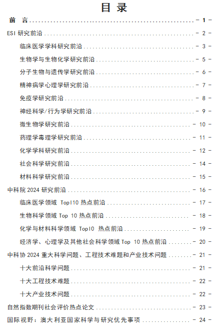 首期报告包括:ESI研究前沿,基于全球范围内高被引论文的研究趋势分析;中国科学院2024研究前沿报告,揭示重点领域的未来发展方向;中国科协2024年度重大科学问题、工程技术难题与产业技术问题,关注科学与技术的前沿挑战。内容提炼了最新学术趋势与热点问题,为科研人员提供研究方向参考,促进跨领域协作,同时为科研决策提供有力的情报支撑。