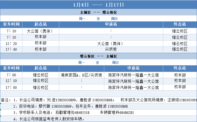 按照AB平台要求,2025年1月4日至1月17日期末考试。为保证老师正常工作和学习。交通车调整如下。
