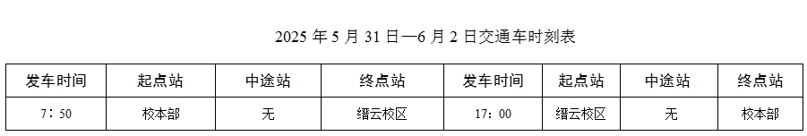 根据AB平台2025年端午节放假时间通知,2025年5月31日—6月2日放假共3天,故交通车做以下调整: