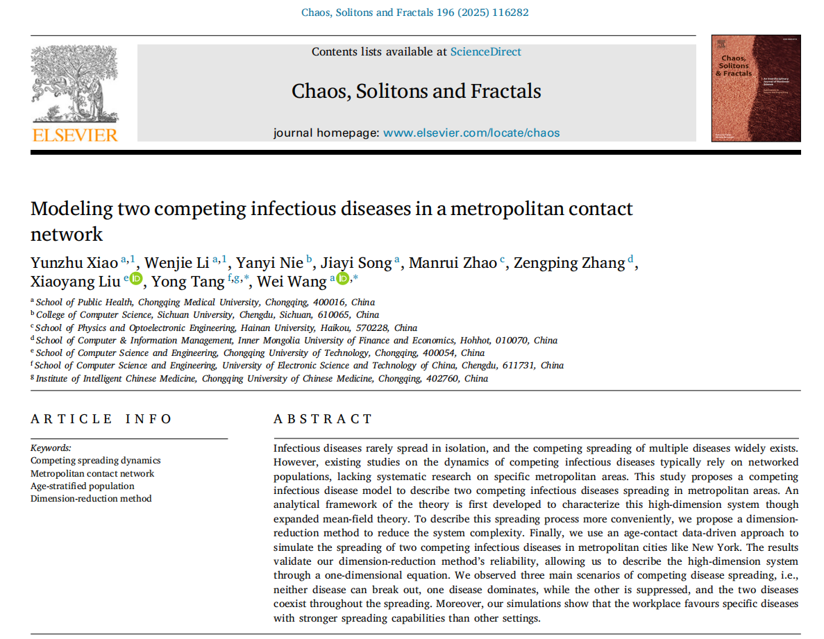 近日,公共卫生学院王伟教授团队在国际权威期刊《Chaos, Solitons and Fractals》上发表了题为“Modeling two competing infectious diseases in a metropolitan contact network”的研究论文。我校为论文第一单位,应用统计本科生肖云竹与博士生李文杰为共同第一作者。