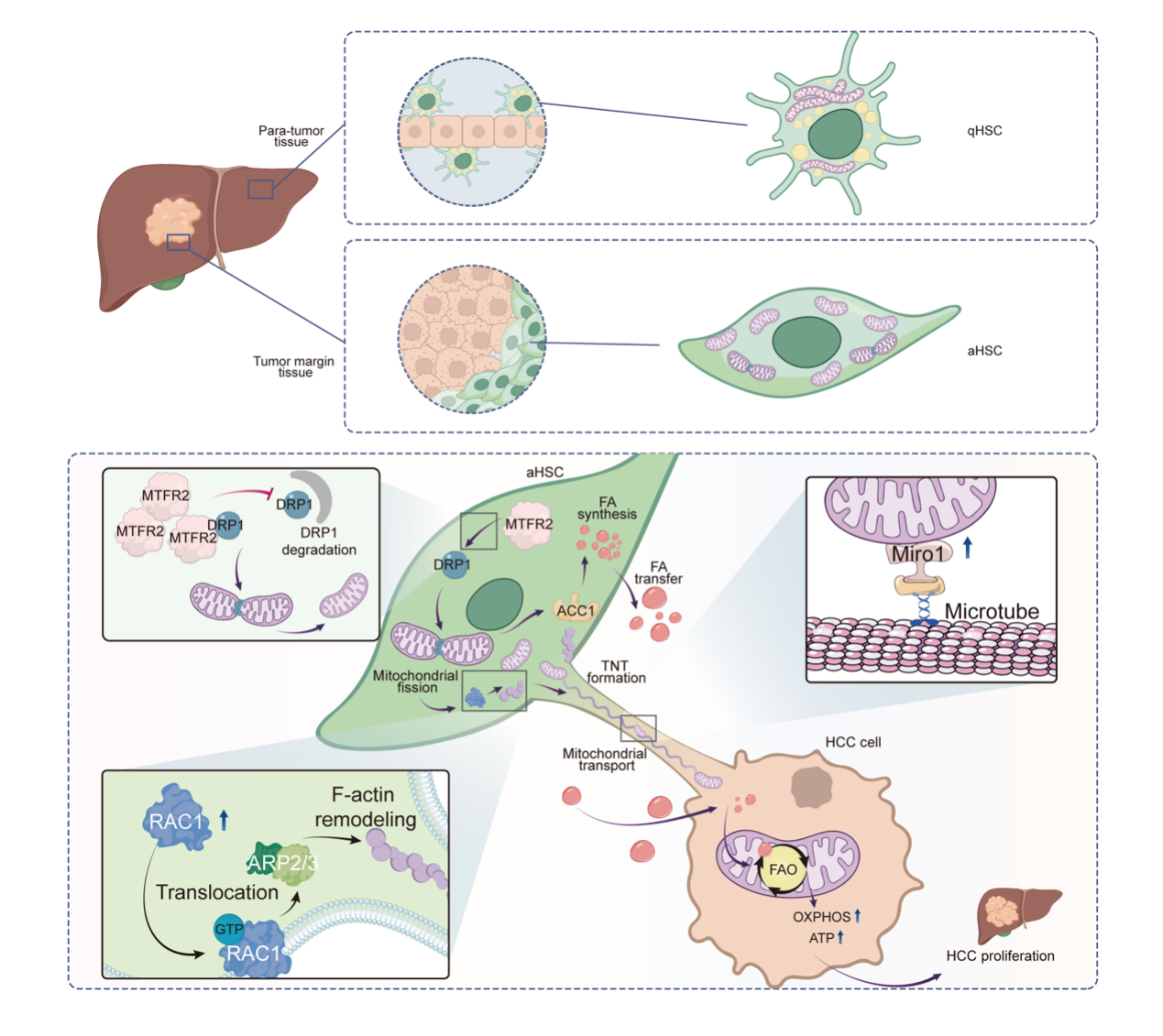 肝细胞癌(HCC)作为一种常见且恶性程度高的肿瘤,严重威胁人类健康。在HCC边缘区域内的癌细胞具有独特代谢以满足其侵袭特征,然而其依赖脂肪酸氧化(FAO)获取能量的机制尚不明确。该团队发现肿瘤边缘激活的肝星状细胞(aHSCs)中,线粒体裂变调节因子2(MTFR2)发挥关键作用,通过促进线粒体分裂,介导脂肪酸和线粒体向HCC细胞的转移;在癌细胞内,脂肪酸作为燃料,线粒体作为工厂,协同增强FAO水平,为肿瘤生长提供支持。