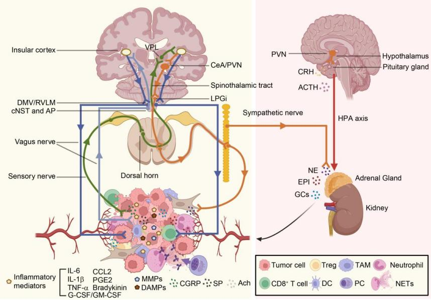 神经系统作为机体的核心调控网络,不仅主导运动、感觉和认知等基础生理功能,更通过与免疫系统的双向通讯在肿瘤发生发展中发挥关键作用。经典肿瘤微环境(TME)理论聚焦于肿瘤细胞、免疫细胞、成纤维细胞及分泌因子组成的复杂生态系统,却长期忽视神经组分的关键作用。最新研究表明,TME中存在复杂的神经-免疫-肿瘤细胞互作网络。神经系统通过局部调控机制(如感觉神经/交感神经/副交感神经支配及胶质细胞调节)和系统调控途径(包括昼夜节律同步、压力调控和脑肠轴协调)塑造肿瘤免疫微环境(TIME)。为维持生存优势,肿瘤细胞可模拟神经元抗炎表型表达特定分子,从而逃避免疫监视。这种分子拟态会导致免疫系统对神经组织的误攻击,引发神经损伤、加重患者病情并提高死亡率。