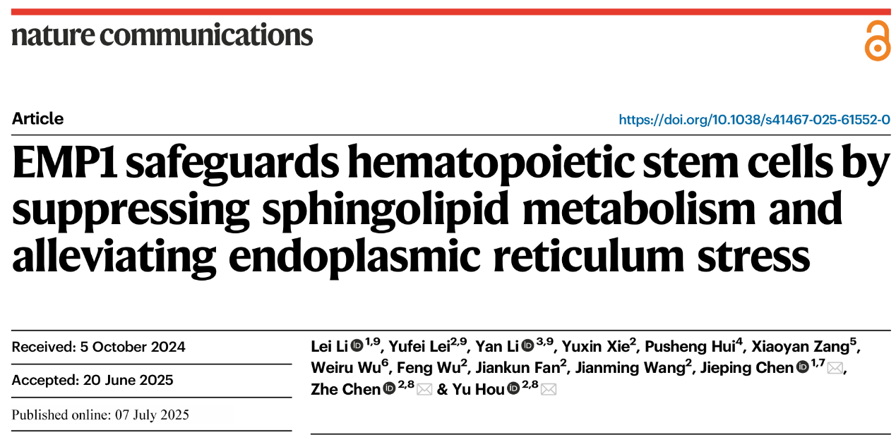 近日,我校基础医学院侯宇教授、陈哲副教授联合陆军军医大学第一附属医院血液内科陈洁平教授团队,在Nature Communications杂志在线发表了题为EMP1 safeguards hematopoietic stem cells by suppressing sphingolipid metabolism and alleviating endoplasmic reticulum stress的研究论文,该研究发现内质网应激是HSCs放射损伤的重要原因,并揭示膜蛋白EMP1是调控HSCs自我更新的关键基因,阐明其通过限制鞘脂代谢、抑制蛋白聚集体、缓解内质网应激,进而促进HSCs抵抗电离辐射的分子机制。