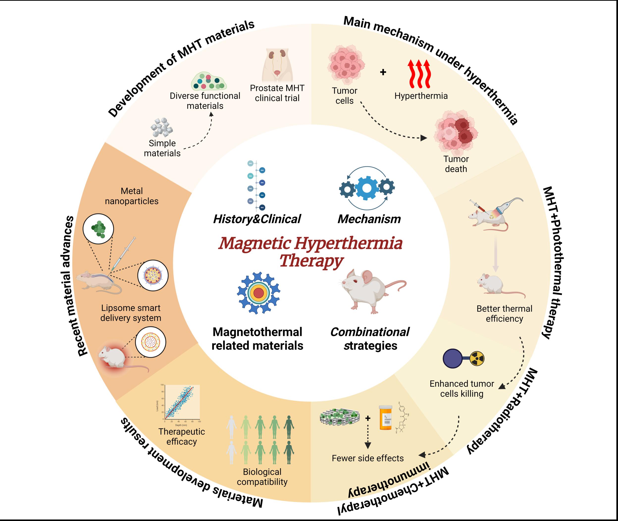 癌症传统疗法面临一些局限:手术难以清除微转移灶,化疗存在全身毒性,放疗对深部肿瘤穿透不足且易诱发耐药。肿瘤微环境(TME)的缺氧与酸性特征进一步强化癌细胞顽固性,制约患者5年生存率提升。在此背景下,磁热疗(MHT)——通过热疗精准杀灭癌细胞的技术——正突破治疗困局。梁冰团队在最新综述中系统阐述了其机制与进展。