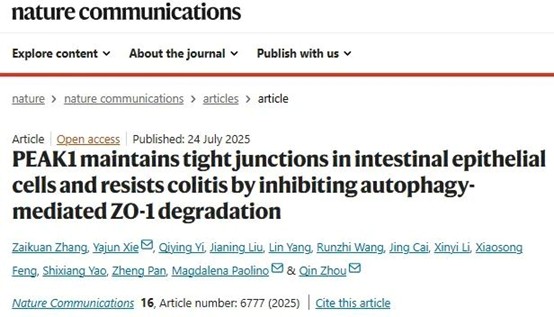 近日,我校检验医学院谢亚均副教授、周钦教授在国际重要学术期刊《Nature Communications》发表了题为“PEAK1 maintains tight junctions in intestinal epithelial cells and resists colitis by inhibiting autophagy-mediated ZO-1 degradation”的研究论文。首次揭示了伪足富集非典型激酶PEAK1(Pseudopodium-Enriched Atypical Kinase 1)在维持肠道上皮细胞紧密连接和屏障功能中的重要作用,可作为肠道上皮细胞紧密连接的新型标志物,为炎症性肠病(IBD)、乳糜泻等肠道屏障功能障碍相关疾病的诊疗提供了新的理论依据和潜在干预靶点。