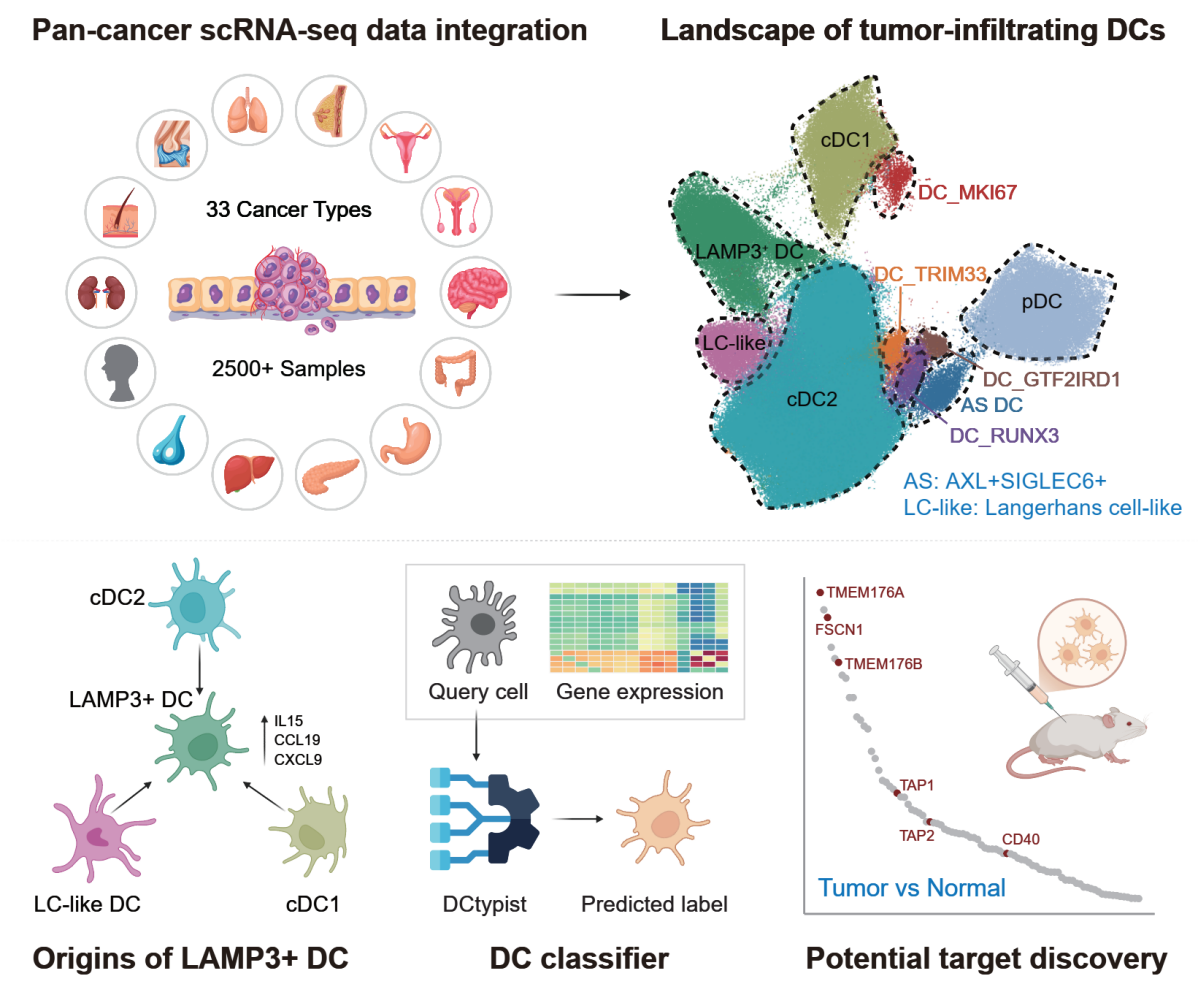 近日,AB平台张泽民院士团队在Cancer Research杂志发表题为“Pan-cancer Analyses Refine the Single-Cell Portrait of Tumor-Infiltrating Dendritic Cells”的重要研究成果,并入选封面论文。该研究系统整合33种癌症类型、超过2,500个样本的单细胞转录组数据,构建了迄今最全面的人类肿瘤浸润树突状细胞(DC)图谱,揭示其发育轨迹、组织分布及功能异质性,为DC靶向免疫治疗提供重要理论支撑。